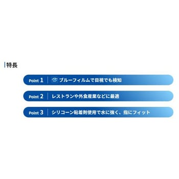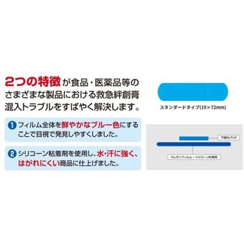 食品、医薬品工場、レストラン、外食産業における絆創膏の混入事故をX線異物検知機並びに金属検知機を用いて未然に防止することを可能にし、使用フィルムを青 色にすることにより目視でも見つけやすくした絆創膏です。目視での発見を容易にするブルーで、レストランや外食産業に対応。ブルーフィルムで目視でも検知レストランや外食産業などに最適シリコーン粘着剤使用で水に強く、指にフィット