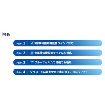 食品、医薬品工場、レストラン、外食産業における絆創膏の混入事故をX線異物検知機並びに金属検知機を用いて未然に防止することを可能にし、使用フィルムを青 色にすることにより目視でも見つけやすくした絆創膏です。