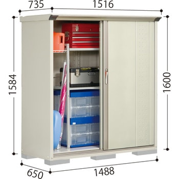 高感度デザインの磨かれた物置。連動吊り戸だから開閉が軽くて静か。耐久性と滑りに配慮のアルミレール。0~35mmのレベル調整が簡単に出来るアジャスター付。安心と便利の2ロックシステム錠。調節簡単で丈夫な棚。サビに強い高級焼付塗装。便利なアルミフック184個付。