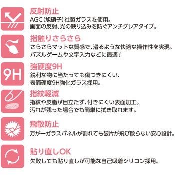 AGC(旭硝子)社製ガラスを使用し、透明度が高く写真や動画を色鮮やかに再現するスーパークリア液晶保護ガラスパネル。表面硬度9H強化ガラスで傷がつきにくく、指紋や皮脂が付きにくく、残った場合でも簡単に拭き取れる表面加工を施しています。