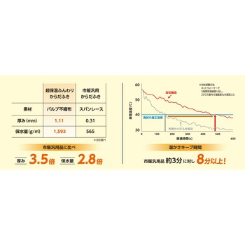 超厚手(※一般品の約3.5倍)でたっぷり保水(※一般品の約2.8倍)ができるシートのため、1枚で広範囲を拭くことができ、使用枚数や作業時間の削減ができます。シートの空間で汚れをキャッチでき、ほどよい柔らかさのため、細かい部分もしっかり拭けます。「温めても使う時にはすぐ冷めてしまう」という現場の問題を解決!温めた際、取り出してから8分以上も40℃以上をキープできるため、使う際にはヒヤッとすることなく清拭ができます。ある大手病院では、およそ3人中2人に冷めにくさを実感していただきました。