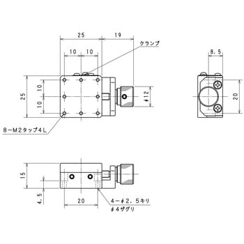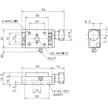 ・X軸ネジ送りステージは、ショートストロークの微動調整に優れたX軸ステージです。・クランプで移動調整の固定・開放をして、調整ネジでステージを移動します。X11-001、X11-002のクランプは、M2ナベネジです。・駆動方式はネジ式 (P=0.5mm) 、移動ガイドはアリ溝式を採用しています。・小型・軽量な構造は、組込用途にも適しています。・材質は、三価クロムメッキの真鍮です。