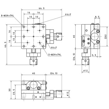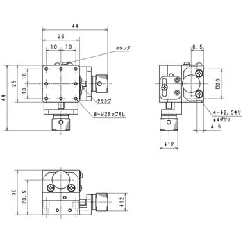 ・XY軸ネジ送りステージは、ショートストロークの微動調整に優れたXY軸ステージです。・各クランプで移動調整の固定・開放をして、各調整ネジで各軸のステージを移動します。X12-001、X12-002のクランプは、M2ナベネジです。・駆動方式はネジ式 (P=0.5mm) 、移動ガイドはアリ溝式を採用しています。・小型・軽量な構造は、組込用途にも適しています。・材質は、三価クロムメッキの真鍮です。