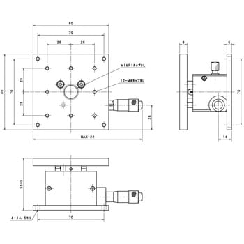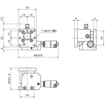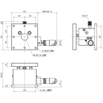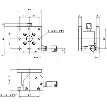 ・Z軸フラットアルミステージは、ステージ面を水平に保持し、Z軸方向に移動調整が可能なZ軸ステージです。・駆動方式はマイクロメータヘッドであり、微細な調整が可能です。・移動ガイドについて、ステージ面 □25, □40のタイプでは すり合わせ機構を採用し、その他のタイプでは クロスローラガイドを採用して滑らかな移動ができます。・クランプで移動調整の固定・開放をして、マイクロメータヘッドでステージを昇降します。・材質は、主に黒アルマイト仕上げのアルミニウムです。
