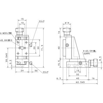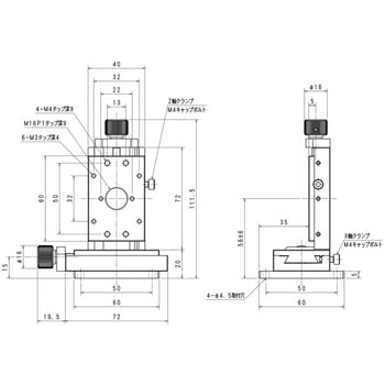 ・XZ軸ネジ送りステージは、ステージ面を垂直に保持し、XZ軸方向に移動調整が可能なXZ軸ステージです。・各クランプで移動調整の固定・開放をして、各調整ネジで各軸のステージを移動します。X14-001、X14-002のクランプは、M2ナベネジです。・駆動方式はネジ式 (P=0.5mm) 、移動ガイドはアリ溝式を採用しています。・小型・軽量な構造は、組込用途にも適しています。・材質は、三価クロムメッキの真鍮、黒アルマイト仕上げのアルミニウムです。