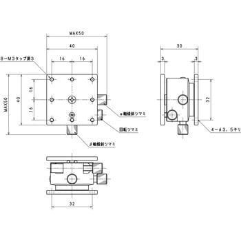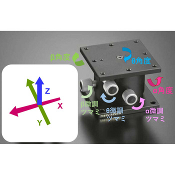・傾斜回転ステージは、αβθの角度を±3°の範囲で姿勢調整や基準出しが可能なαβθ軸ステージです。・球面滑り軸受の機構により、回転θと傾斜角度αβの微動調整が可能です。・光学系用途の他、測定・分析用治具としても有用です。・材質は、主に黒アルマイト仕上げのアルミニウムです。