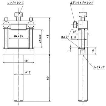 ・シリンドリカルレンズホルダは、シリンドリカルレンズ、フィルタ、ミラー等の角型素子(矩形素子)を固定するホルダです。・光学素子を固定する上下の部品には、素子側にコルクシートを貼り付けており、素子のずれを抑えます。・ホルダには、Φ12mm L=60mmのポールを標準装備しています。・材質は、主に黒アルマイト仕上げのアルミニウムです。