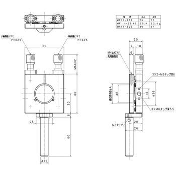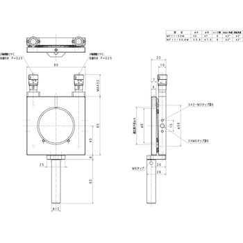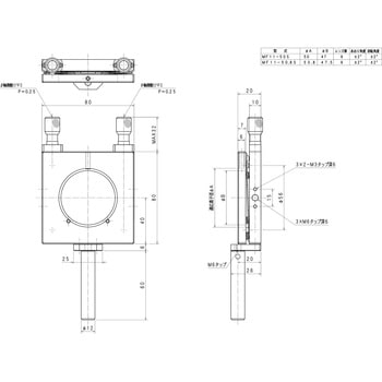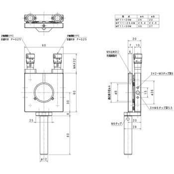 ・あおり角度の微動方式(微動調整のツマミ)は、マイクロメータヘッド と 微調ネジのタイプ(どちらもP=0.25mm)から選べます。