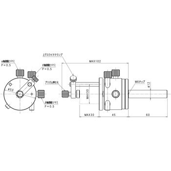・上下スライドクランプを締めてプリズム押え部の高さを決め(仮固定し)、押え部上部のネジを締めて、プリズムを最終的に固定します。