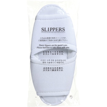 包装フィルムに「これはお客様の専用スリッパです。ご使用後はご自由にお持ち帰りください。」の内容が5ヶ国語(日本語・英語・中国語・韓国語・台湾語)で表記されています。完封包装品です。