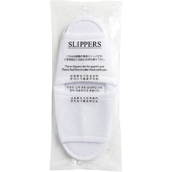 包装フィルムに「これはお客様の専用スリッパです。ご使用後はご自由にお持ち帰りください。」の内容が5ヶ国語(日本語・英語・中国語・韓国語・台湾語)で表記されています。完封包装品です。