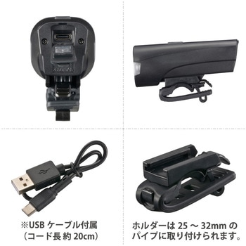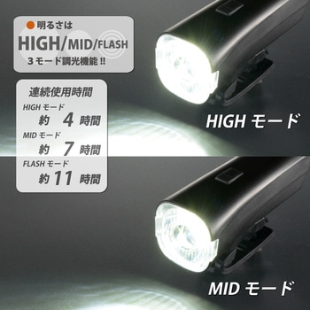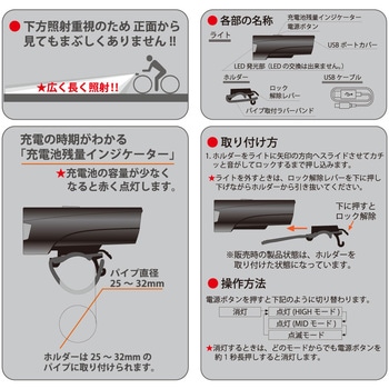 明るさはHIGH・MID・FLASHの3モード切替に対応した充電式LEDサイクルライトです。充電池の残量が少なくなると、残量インジケーターでお知らせするため、使用中の電池切れを防ぎます。ラバーバンド固定方式により、工具不要で簡単に自転車へ取り付け可能です。下方照射を重視した配光設計のため、正面から見てもまぶしさを感じにくく、安全性に配慮しています。USB充電式のため、パソコンやモバイルバッテリーから手軽に充電できます。