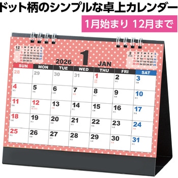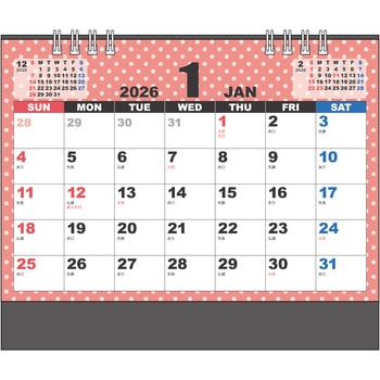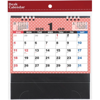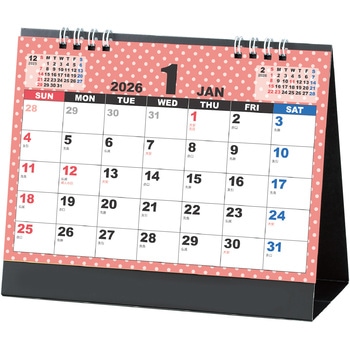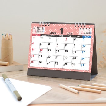 シンプル可愛い!実用性の高い卓上カレンダー!ドット柄がかわいらしい、シンプルデザインの卓上カレンダーです。書き込みスペースも十分あるため、毎日の予定をしっかり記入できます。日付の視認性が高く、ビジネスでも家庭でも活用できる見やすいデザインで、予定管理をスマートにサポートします。両面印刷の6枚構成なので、ページが少なく扱いやすいのもポイントです。1年を通して快適に使える構成になっています。企業の名入れや贈答品にもおすすめです。