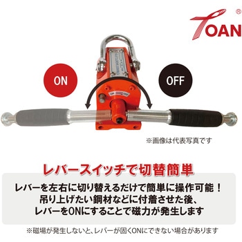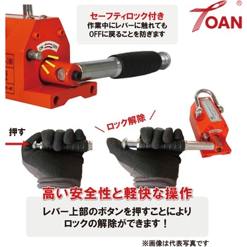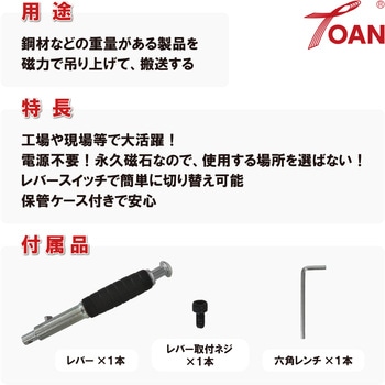電源不要!永久磁石なので、使用する場所を選ばない!レバースイッチで簡単に切り替え可能保管ケース付き(木箱のケース)で安心レバースイッチで切替簡単:レバーを左右に切り替えるだけで簡単に操作可能!吊り上げたい鋼材などに付着させた後、レバーをONにすることで磁力が発生します※磁場が発生しないと、レバーが固くONにできない場合がありますセーフティーロック付き作業中にレバーに触れてもOFFに戻ることを防ぎます