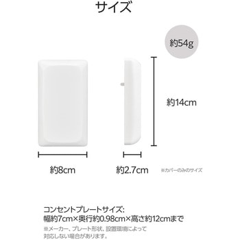 セット内容本体、取り付け用ダミープラグ ※スイングプラグタップは付属していません。材質ポリカーボネートホワイト質量(g)54適合規格壁面コンセント寸法(幅W×奥行D×高さH)(mm)80×35×140(ダミープラグ含む)、80×27×140(カバーのみ)適合サイズコンセントプレートサイズ適合プラグエレコム製スイングプラグタップに対応 ※スイングしないプラグは非対応です。内容量1個
