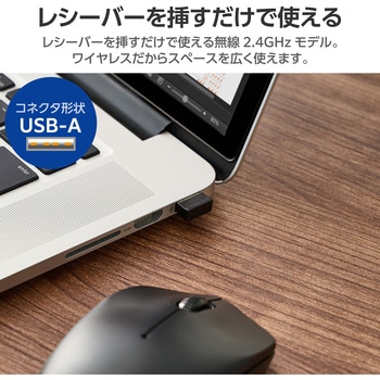 パソコンのUSB-Aポートにレシーバーを挿すだけで使える無線2.4GHzモデル。ワイヤレスだからデスク周りがすっきりして、スペースを広く使えます。