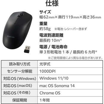 付属品動作確認用単3形アルカリ乾電池×1本色ブラックサイズL質量(g)【レシーバー】2【マウス】58 ※電池含まず電源単3形アルカリ乾電池、単3形マンガン乾電池、単3形ニッケル水素電池のいずれか1本対応OSWindows 11/10、mac OS Sonoma 14、Chrome OSコネクタ形状USB-A プラグ接続方式USB2.4GHz無線分解能(dpi)【センサー】1000寸法(幅W×奥行D×高さH)(mm)【マウス】62×119×36【レシーバー】13×19×6対応機種USB-Aポートを装備したWindows、macOS、Chrome OS搭載機対応レシーバー収納保証期間1年間電池寿命最長6カ月(アルカリ乾電池使用時の目安) ※ご使用環境により異なる場合があります。ボタン数3個 ※ホイールボタン含む電波到達距離(m)~10 ※ご使用環境により異なる場合があります。RoHS指令(10物質対応)対応ホイール数1個読取方式光学式電波周波数2.4GHz帯内容量1個