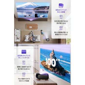 壁から15cm離すだけで100インチ投影可能な超単焦点モデル。小さな部屋でも大画面の映像を楽しむことができます。また超単焦点なら光を遮るものの心配なしでOK。
