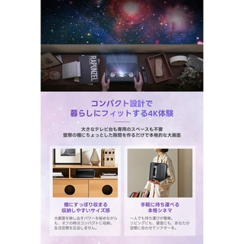 本体サイズは312×290×140cm、重量4.5kgと軽量コンパクト。使わない時は収納出来てすっきり。また、リビング、寝室、書斎など手軽に持ち運んでホームシアターを楽しむことができます。移動させた後の画面調整はすべて自動で対応。台形補正やオートフォーカス、デジタルズームやスクリーンフィットなど簡単に画面を最適化してくれます。