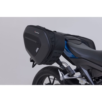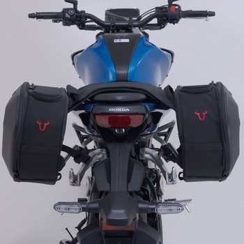 サポートアームにバッグを差し込むだけで素早く装着できます。アームは、横方向の動きを防いでバッグを安定させます。バッグを外すときにはサポートアームから簡単に引き抜くことができ、オートバイの外観を崩すことがありません。