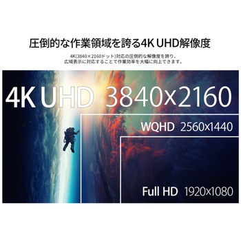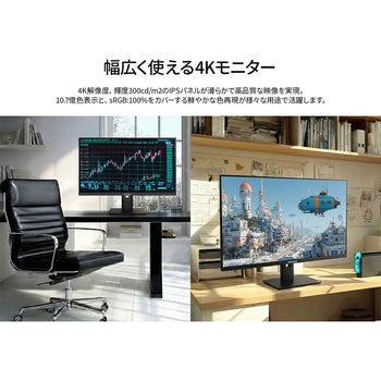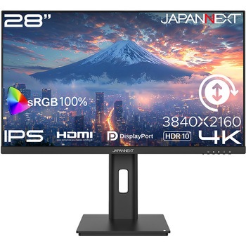 28インチのIPSパネルを搭載し、4K(3840x2160)解像度に対応した液晶モニターです。フルHD(1920x1080)の4倍の高解像度は複数のウィンドウの同時表示を可能にし、圧倒的な高生産性を実現します。あらゆる角度から見ても色やコントラストの変化がおきにくいIPSパネルを搭載し、広視野角上下左右178°を実現します。最大輝度300cd/m2の液晶パネルはsRGB:100%の広色域に対応。HDR(ハイダイナミックレンジ)に対応。明るい部分も暗い部分もくっきり表現。HDCP2.2対応で4K配信動画もお楽しみ頂けます。高さ調整が可能な昇降式多機能スタンドを搭載、最大135mmの範囲(横置時)で最適な高さに画面を調整可能です。また、縦画面として使用出来るピボット(回転)機能にも対応します。スイーベル(首振り)機能は、左右各30°の範囲で動かせます。インターフェイスは、HDMI 2.0 x2 (60Hz)、DisplayPort 1.4 x2 (60Hz)を装備し、様々な機器との接続が可能です。モニター画面のフリッカー(ちらつき)、およびブルーライト(青色光)を軽減し、目の負担を軽くします100x100mmのVESAマウントに対応。2Wx2のスピーカーを搭載します。本製品には、2年間のメーカー保証が付きます。