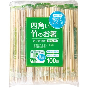 ポリ完封節付竹角箸20cm 100膳楊枝入