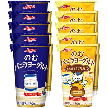 1点のみご購入の場合は、セット商品のみで梱包してお届けします。複数個購入や他の商品と一緒にご購入いただいた場合は、同梱してお届けすることがあります。[冷蔵] 日本ルナ のむバニラヨーグルト 170g×5本/[冷蔵] 日本ルナ のむバニラヨーグルト とろける はちみつ 170g×5本/を詰め合わせております。