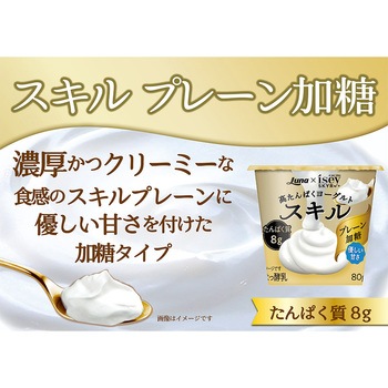 まるでスイーツのような高たんぱくヨーグルトスキルシリーズの スキルプレーンに優しい甘さをつけた加糖タイプでたんぱく質を8g摂取でき脂肪ゼロ&100kcal以下。そのまま食べて頂くのはもちろんご家庭でアレンジしながら食べるのも楽しんで頂ける商品です。