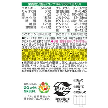「野菜生活100」オリジナルは20種類の野菜と3種類の果実を使用した野菜果実ミックスジュースです。1食分の野菜を使用し(200ml当たり)野菜汁70%+果汁30%=100%。野菜比率70%でありながらフルーティーなおいしさを実現。β-カロテンの高いにんじん汁を厳選。にんじんの青臭い香りをカットしにんじん汁のコクと甘みで家族みんながおいしく手軽に野菜を補えます。厚労省推進健康日本21の目標値(1日350g)の約1/3である野菜120g分。野菜の全成分を含むものではありません。