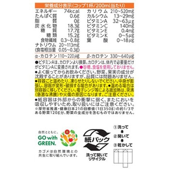「野菜生活100」マンゴーサラダは黄にんじん黄ピーマンかぼちゃなど黄の野菜を含む20種類の野菜と6種類の果実を使用した野菜果実ミックスジュースです。1食分の野菜(200ml当たり)を使用し野菜汁70%+果汁30%=100%。野菜比率70%でありながらフルーティーなおいしさを実現。すっきりとした味わいが特徴の黄にんじんとβ-カロテンが豊富な橙にんじんを使用。にんじんの青臭い香りをカットにんじん汁のコクと甘みで家族みんながおいしく手軽に野菜を補えます。厚労省推進健康日本21の目標値(1日350g)の約1/3である野菜120g分。野菜の全成分を含むものではありません。