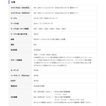 用途720P 1920x1080(60Hz) 4K2K(30Hz)解像度に対応その他【ARC・eARC】非対応備考コネクタには方向性が有ります。送信機器→表示機器適合規格DVIケーブル2芯メガネタイプ / OM4マルチモード / 両側LCコネクタ取付タイプ / LSZH対応コネクタDVIRoHS指令(10物質対応)対応ケーブル太さ(mm)2.0×2対応解像度720p /フルHD (1920×1080 60Hz) / 4K2k (30Hz)給電方式DC 5V給電ケーブル(接続口1.35mm)をコネクタ給電部に接続して給電。(機器側・表示側)転送速度(Gbps)10.2イーサネット対応非対応HDCP対応非対応内容量1本