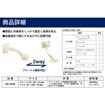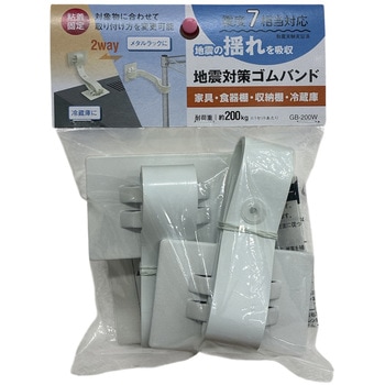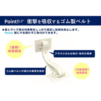 壁に穴を開けずに壁と対象物を固定し転倒を防止します。ゴム製ベルトは揺れを吸収し衝撃を軽減します。対象物に合わせて「貼り付ける」または「巻きつける」2通りの設置方法が可能です。震度7相当の耐震実験実証済み。