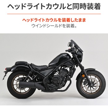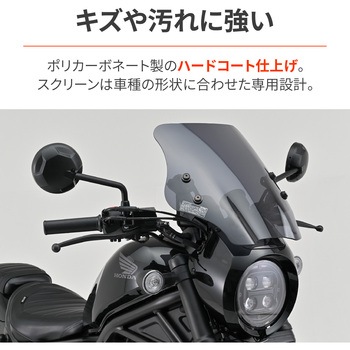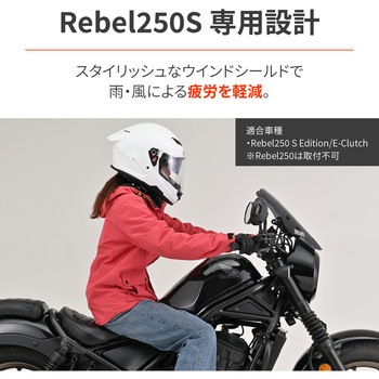 レブル250 Sエディション/Eクラッチ専用のウインドシールド。スタイリッシュデザインのウインドシールドで雨・風での疲労を軽減。ボルトオンで取り付けが可能です。スクリーンは耐衝撃性に優れるポリカーボネートにハードコーディングを施し傷つきを防止。スマートフォンホルダーなどの装着に便利なΦ22.2のクランプバー付属。