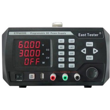 単一出力・高出力タイプのプログラマブル直流安定化電源です。4桁LEDデジタル表示を搭載し、定電圧(CV)/定電流(CC)モードを自動切替します。出力電圧および電流制限値は連続可変で、スイッチング電源方式の採用により、高効率・軽量・省エネルギーを実現しています。さらに、5V/2AのUSB充電機能を備えています。