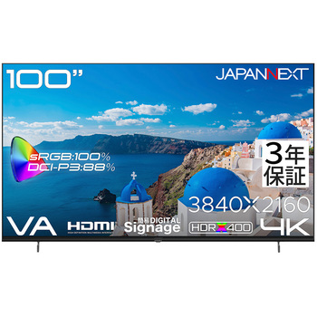 100インチの大画面で4K(3840x2160)解像度に対応。高画質VAパネルを採用、5000:1の高コントラスト比は、より黒をくっきりと表現することが可能。写真や動画を色鮮やかに映し出します。最大輝度450cd/m2、sRGB:100%、DCI-P3:88%の広色域に対応、HDR400相当の性能を持ちます。HDRは明るい部分も暗い部分もくっきり表現。HDCP2.2対応で4K配信動画もお楽しみ頂けます。インターフェイスは、HDMI 2.0 x3を搭載。さらに、USBポートを搭載していますので、デジタルサイネージとしてもご利用できます(屋内使用のみ)。また、ビデオ/音声入力端子x1、コンポーネント入力端子x1および、オプティカル音声出力端子x1を搭載。長時間使用時に眼に優しいフリッカー(ちらつき)軽減モードおよび、ブルーライト軽減モードを搭載します。800x400mmのVESAマウントに対応しますので、対応の壁掛け金具やスタンドなどに取り付けが可能です。10Wx2のスピーカーを内蔵します。便利なリモコンを同梱。USBメモリ再生、メニュー操作、音量調整や入力切替などの操作を行えます。本製品には、5年間のメーカー保証が付きます。なお、2年保証モデル「JN-V100U-M」および5年保証モデル「JN-V100U-M-H5」も同時に発売となります。