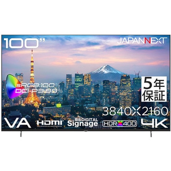 100インチの大画面で4K(3840x2160)解像度に対応。高画質VAパネルを採用、5000:1の高コントラスト比は、より黒をくっきりと表現することが可能。写真や動画を色鮮やかに映し出します。最大輝度450cd/m2、sRGB:100%、DCI-P3:88%の広色域に対応、HDR400相当の性能を持ちます。HDRは明るい部分も暗い部分もくっきり表現。HDCP2.2対応で4K配信動画もお楽しみ頂けます。インターフェイスは、HDMI 2.0 x3を搭載。さらに、USBポートを搭載していますので、デジタルサイネージとしてもご利用できます(屋内使用のみ)。また、ビデオ/音声入力端子x1、コンポーネント入力端子x1および、オプティカル音声出力端子x1を搭載。長時間使用時に眼に優しいフリッカー(ちらつき)軽減モードおよび、ブルーライト軽減モードを搭載します。800x400mmのVESAマウントに対応しますので、対応の壁掛け金具やスタンドなどに取り付けが可能です。10Wx2のスピーカーを内蔵します。便利なリモコンを同梱。USBメモリ再生、メニュー操作、音量調整や入力切替などの操作を行えます。本製品には、5年間のメーカー保証が付きます。なお、2年保証モデル「JN-V100U-M」および3年保証モデル「JN-V100U-M-H3」も同時に発売となります。