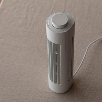 スリムなUSB扇風機です。立てても横にしても使える、収まりの良い形に整えました。フック穴があるので吊るすこともできます。デスクワークやキッチンでの作業など、少し風が欲しい時に便利です。