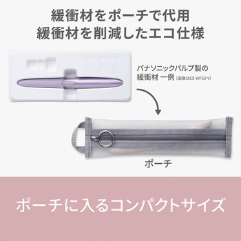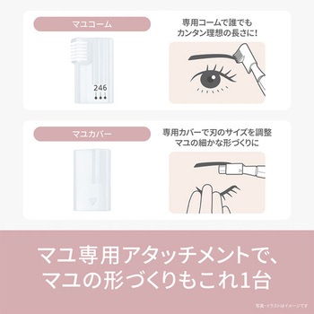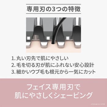 丸い刃先で肌にやさしい、約0.12mmのうす刃。水なしですっきり剃れる。肌の凸凹に合わせて動く、密着スイングヘッド。マユのお手入れができる。マユカバーとマユコーム付き。