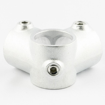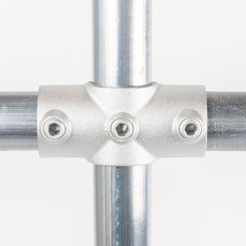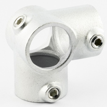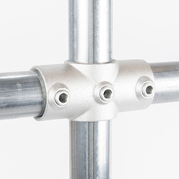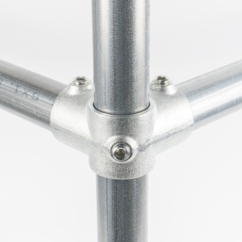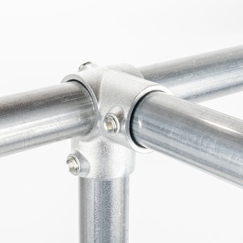 一般的な単管パイプ(外径48.6mm)専用の高強度ジョイント金具です。工具1つで簡単に組立ができ、作業性に優れています。M16の大径ビスを採用しており、締付操作が安定し施工性に優れています。クランプのような突起が無く、すっきりした形状で意匠性の高い仕上がりが可能です。電気亜鉛メッキによる均一で光沢感のある仕上げで、外観を重視する施工に適しています。取付幅が小さく、省スペースでの製作にも適しています。デザイン什器から内装展示什器まで幅広い用途で活用できます。
