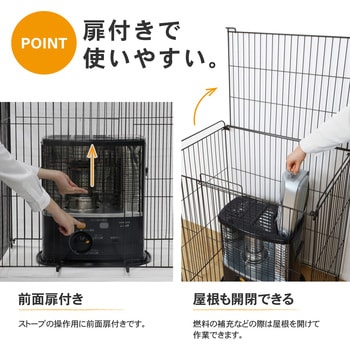 犬や猫も入りにくい柵の間隔35mm未満。屋根を取り出し、うしろに掛けられるので、ストーブの出し入れに便利。屋根付きですので、お子様やペットのストーブの操作を防止します。ストーブを金具に乗せ加重でとめる固定金具付。ストーブの操作に便利なストッパー付スライド開閉扉。