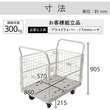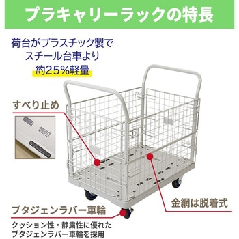 不定形、不安定物の運搬、一時保管に、安全で効率的な作業をお手伝い。ペダル式フットブレーキシステムを採用。金網は脱着式です。荷台がプラスチック製でスチール台車より約25%軽量です。タイヤはクッション性静粛性耐候性に優れたブタジェンラバー(BR)を採用しています。
