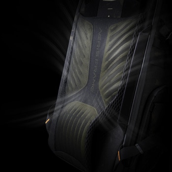 AerisFrame サスペンションシステム:背面の吊り下げ式ベンチレーテッドバックパネルが背中に沿ってフィットし、安定性・安心感・快適な背負い心地を実現します。厚手パッド入りのワイドショルダーストラップと調整式チェストストラップが肩への負荷を効果的に軽減。背面パネルにはオプションのウエストベルトを取り付けるためのポイントも備え、荷重を身体全体へ分散できます(ウエストベルトは単体で撮影用ウエストベルトとしても使用可能)。