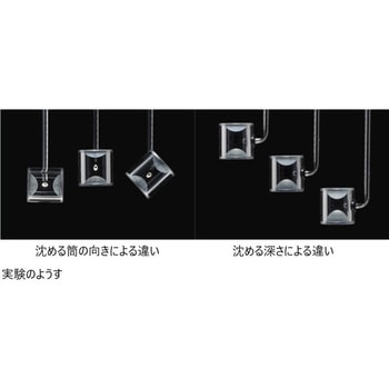 膜のへこみで水圧を視覚的に観察。透明な円筒の両側に取り付けた薄いゴム膜のへこみにより水圧の変化を調べます。円筒を水中に入れると、水圧によりゴム膜が内側にへこみます。このへこみの大小を目盛で読み取ることにより、水圧の強弱を判断することができます。