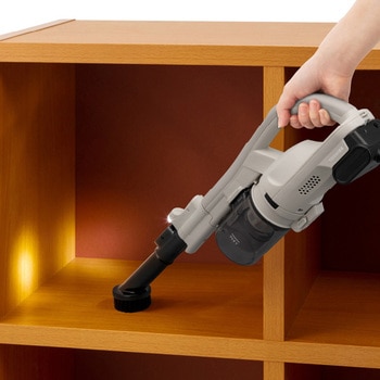 付属品も一緒に収納できるスタンドが付属しており、スッキリ収納が可能です。取り外し可能な「ピカッとライト」も付属し、ハンディ時にも使用可能だから棚の角まで明るく照らしてお掃除可能です。