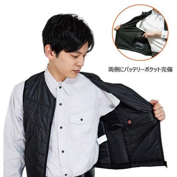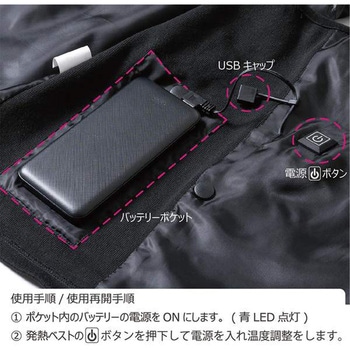 発熱配線に東レの高性能炭素繊維トレカ糸を採用し、素早い熱の伝導性を高めるとともに、安定した発熱により安全性を高めたシックなデザインの発熱ベストとモバイルバッテリーのセットです。前ファスナーにすることで、より高い保温性を実現しました。両脇は伸縮性に富んでおり、動作に合わせフィット感を向上させ熱を逃がさない構造です。左の内側にバッテリーポケットと電源スイッチ、右側にはバッテリーポケットがあり予備のバッテリーを入れられ、便利にご使用いただけます。付属のバッテリーを充電をするだけですぐにご使用いただけるセットです。