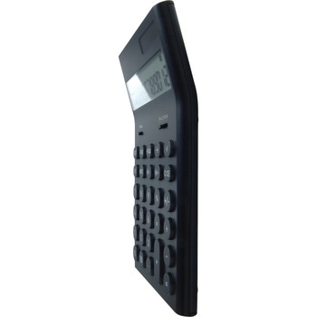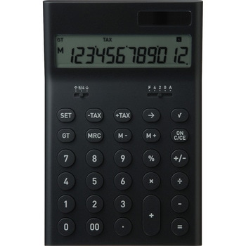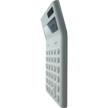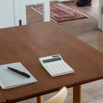 数字を表示する部分が少し斜めに起き上がったかたちが特長です。使いやすいサイズ感、手馴染みのよい丸み、見やすいオリジナルフォントなどこだわりがいっぱいの電卓です。全て同色でまとめた塊感が、お店のカウンターやオフィスのデスク上で静かに存在を主張します。