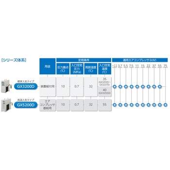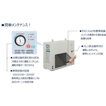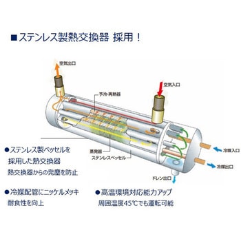 圧縮空気中に含まれる「水蒸気」を取り除き、乾燥した圧縮空気にする冷凍式エアドライヤ(標準入気タイプ)です。