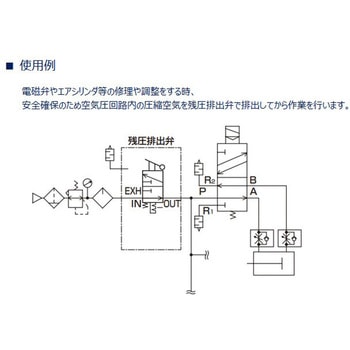 電磁弁やエアシリンダ等の修理や調整をする時、安全確保の為空気圧回路内の圧縮空気を残圧排出弁で排出してから作業を行うことが可能です。