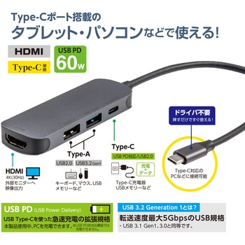 用途タブレット・パソコンなどで使える!付属品取扱説明書・保証書電源バスパワー本体質量(g)36対応OSWindows11、10/macOS10.15以降/ChromeOS/iPadOS16以降(Type-C搭載機器)対応機種USB Type-Cポートが正常に動作するパソコン、タブレット本体寸法(幅W×奥行D×高さH)(mm)81×29×12保証期間6ヶ月ケーブル長(cm)20映像出力【HDMI】最大4K/30Hz(HDCP1.4)転送速度(Gbps)最大5(理論値)最大供給電流(mA)720(USB3.2Gen1ポート)最大供給電圧(V)5(USB3.2Gen1ポート)最大電力(W)【PD】60(電力の一部を製品内部で消費するため、60の充電器に接続した場合55程度の給電になります)インターフェイス-アップストリーム(PC側)USB Type-C オスインターフェイス-ダウンストリーム(接続機器側)USB Type-A(USB3.2Gen1)メス×1、USB Type-C(USB2.0 Alt mode非対応)メス×1、USB Type-A(USB2.0)メス×1、HDMI(タイプA)メス×1USB規格USB3.2Gen1(3.1Gen1/3.0)、2.0内容量1個