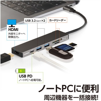 用途ノートPCに便利!付属品取扱説明書・保証書適合【カードリーダー対応スピードクラス】~Class10、UHS-1電源バスパワー本体質量(g)50対応OSWindows10、8.1、8/ChromeOS/macOS10.12以降/iPadOS13.4以降/ Android8以降(ホスト機能搭載機器)対応機種USB Type-Cポートが正常に動作するパソコン、タブレット、スマートフォン本体寸法(幅W×奥行D×高さH)(mm)116×38×11保証期間1年対応メディアSD(HC、XC)、microSD(HC、XC)ケーブル長(cm)15RoHS指令(10物質対応)対応映像出力【HDMI】最大4K/30Hz(HDCP 1.4)転送速度(Gbps)最大5(理論値)最大供給電流(mA)720最大供給電圧(V)5最大電力(W)【PD】100インターフェイス-アップストリーム(PC側)USB Type-C オスインターフェイス-ダウンストリーム(接続機器側)USB Type-Aメス×2、Cメス×1(Alt mode非対応)、HDMI タイプA メス×1USB規格USB3.2Gen1(3.1Gen1/3.0)内容量1個